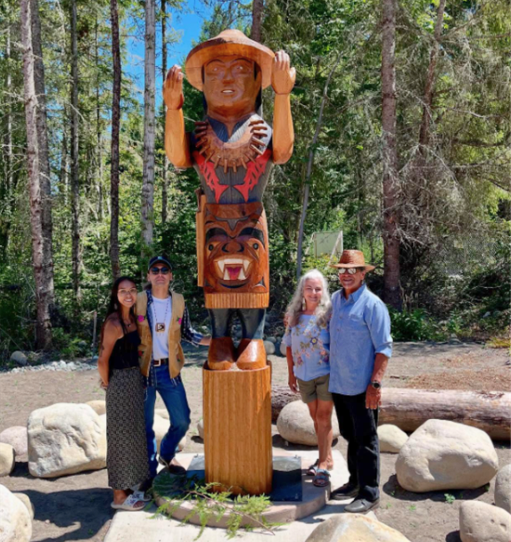 The Welcome Figure was carved as part of an apprenticeship for Ablaza Pluff to learn with teacher NoiseCat. The Welcome Figure was in the tribal cultural center after completion, then installed at the park during summer 2025. There was a small ceremony afterward, attended by the NoiseCat family and many WA Parks and Nisqually employees.